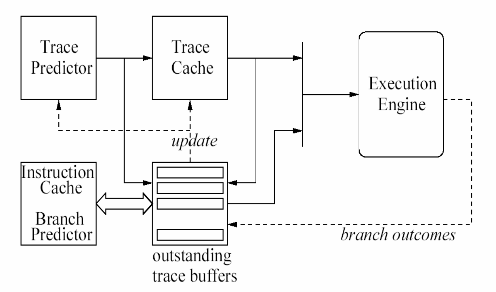 - Trace Cache에 원하는 trace가 없으면(trace miss), Instruction Cache + Branch Predictor를 통해 instruction을 하나씩 fetch하면서 새로운 trace 후보를 outstanding trace buffers에 수집