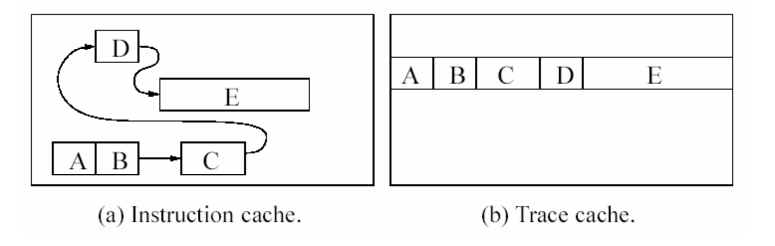 아래 그림 (a)는 기존 Instruction Cache, (b)는 Trace Cache의 차이를 보여줍니다: