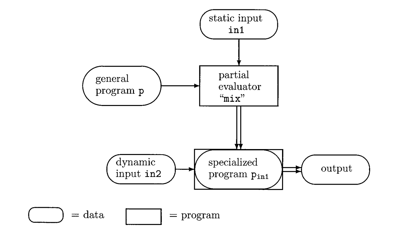 프로그램 p에 고정된 입력 in1(static input)을 주어 부분 평가(partial-evaluate) 한 뒤, 동적 입력 in2(dynamic input)에 의해 영향을 받는 나머지 계산만 수행하는 특화된 프로그램(specialized program) 을 생성합니다. 이렇게 생성된 특화 프로그램은 원래 프로그램 p보다 더 빠르게 실행됩니다.