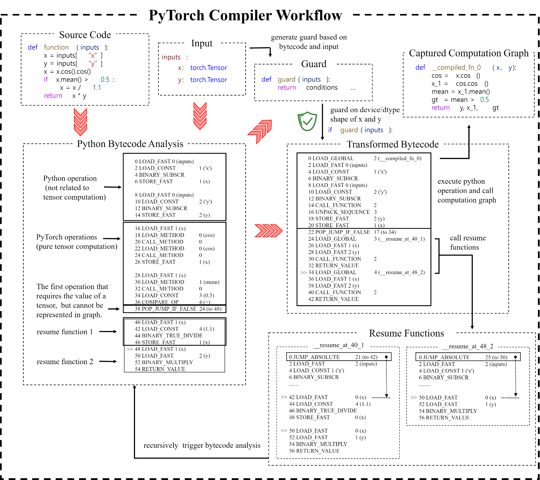 생성: bytecode와 input을 가지고 graph break가 발생할 때까지 실행을 추적하여 trace를 생성하고, bytecode transformation을 수행하여 최적화된 코드를 caching합니다.