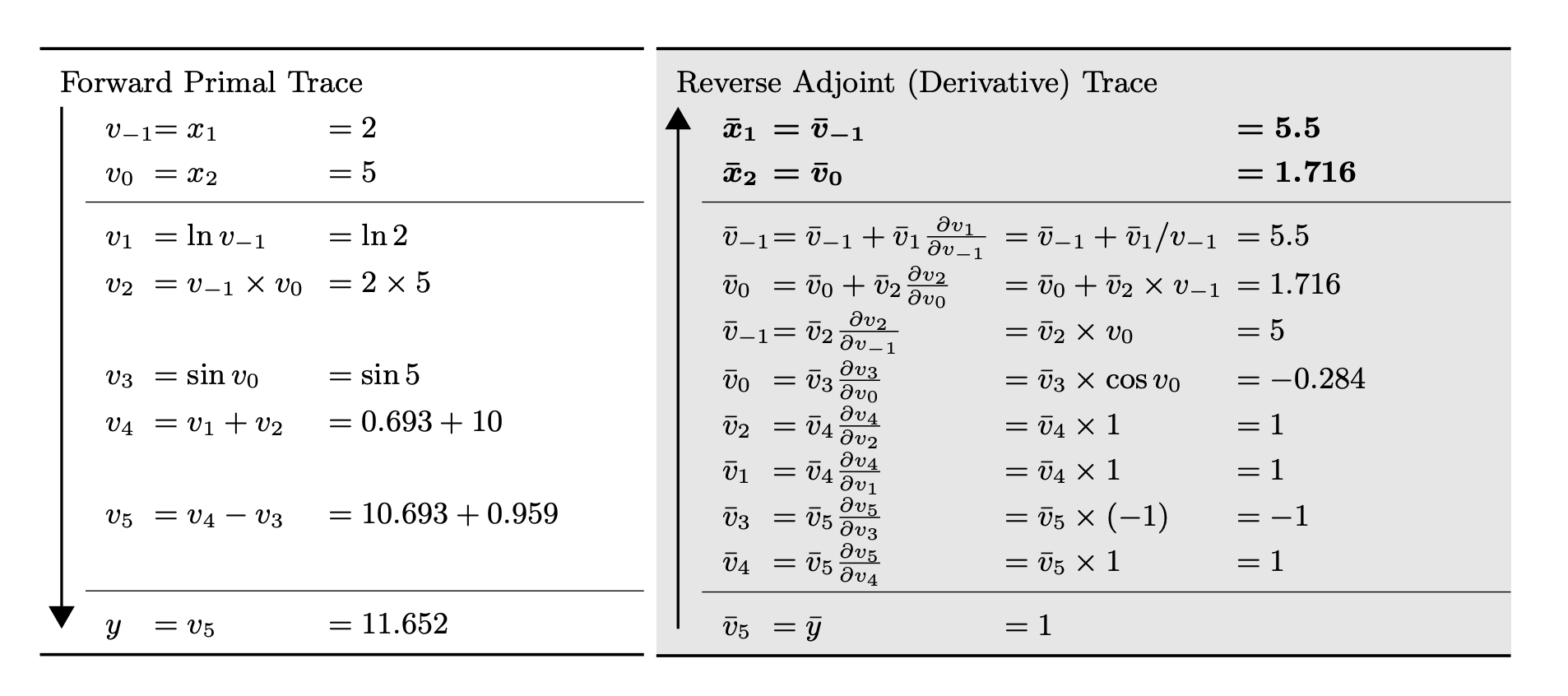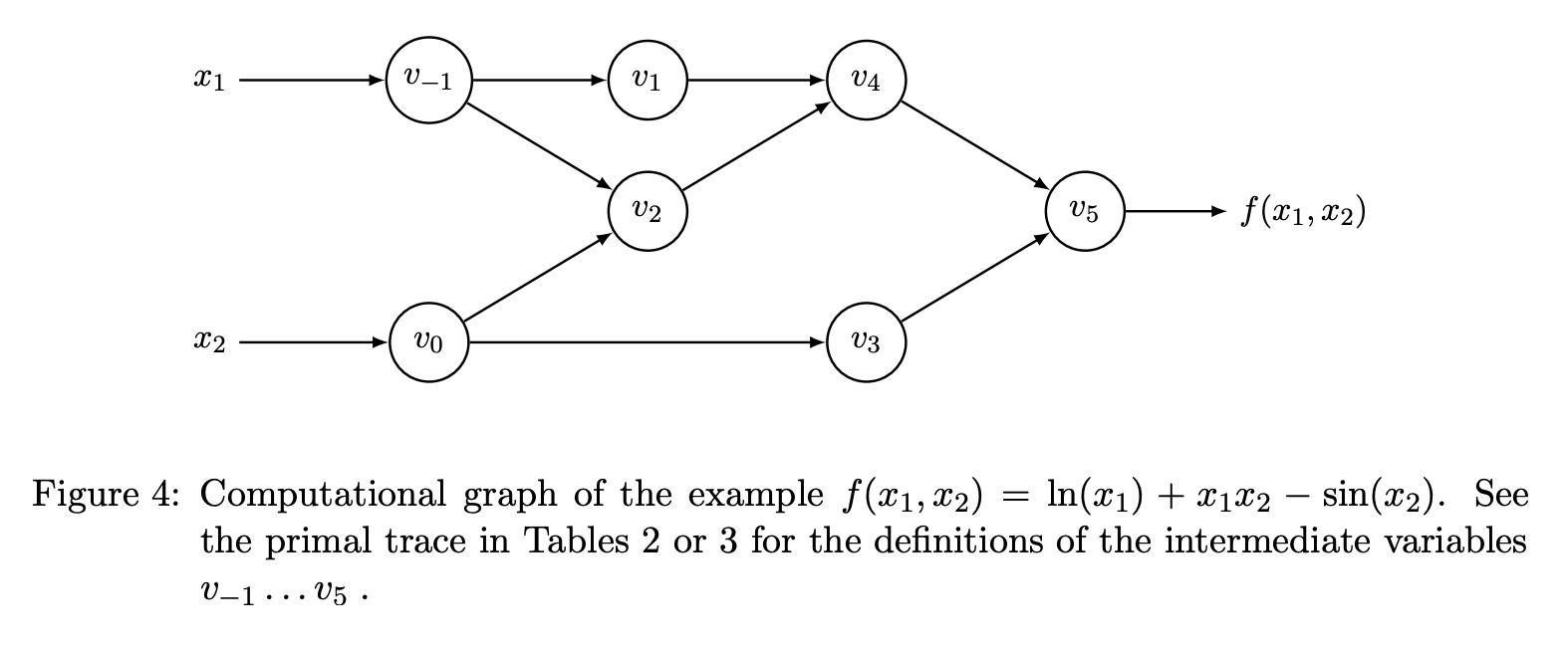 이 함수의 computation graph를 구성하면, 각 중간 연산 노드에서의 gradient를 chain rule을 통해 역방향으로 전파할 수 있습니다. 자세한 내용은 Baydin et al. (2018)을 참고하세요.