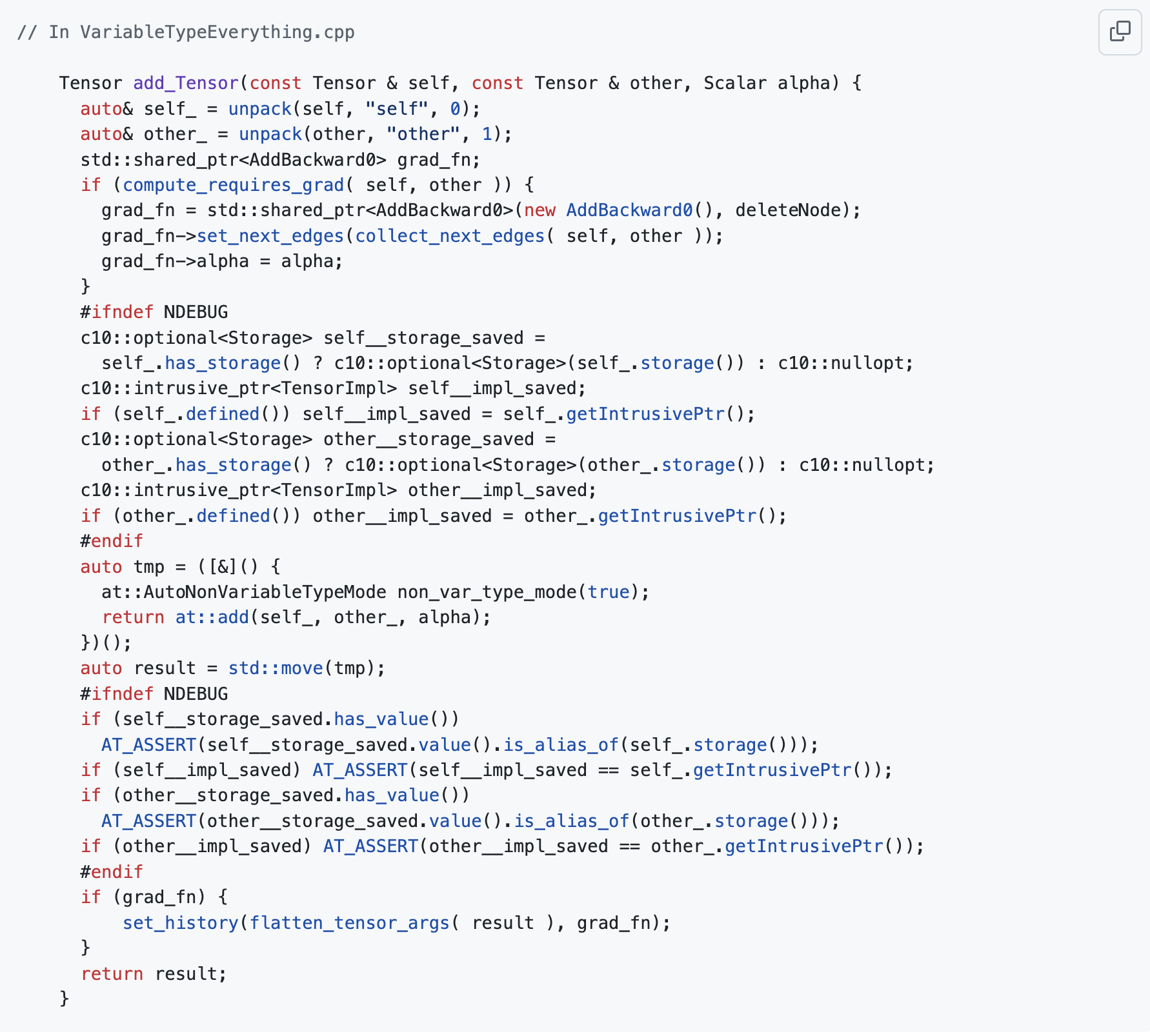 requires_grad가 켜진 텐서가 관여하는 연산에서는 Autograd dispatch key를 사용하여 dispatch가 이루어집니다. 이 커널은 backward에서 호출되는 함수가 아니라, forward에서 add를 처리하는 함수입니다. Forward를 수행하면서 나중에 backward가 될 때 어떻게 처리할지를 미리 기록해 두는 것입니다: