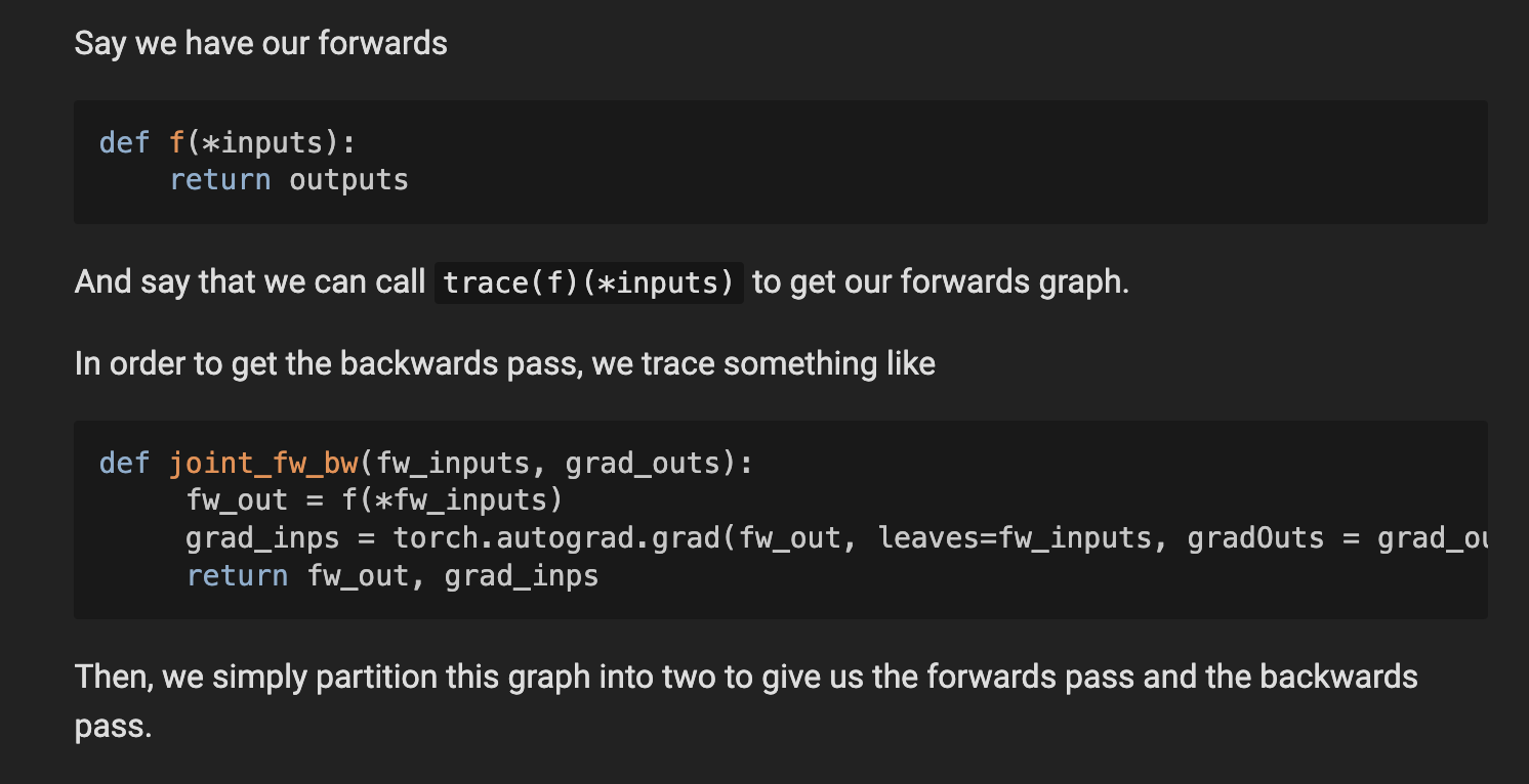 이 두 번째 아이디어를 바탕으로 **AOTAutograd(Ahead-of-Time Autograd)**가 개발되었습니다. 이제부터 AOTAutograd가 실제로 어떻게 동작하는지 하나하나 살펴보겠습니다.