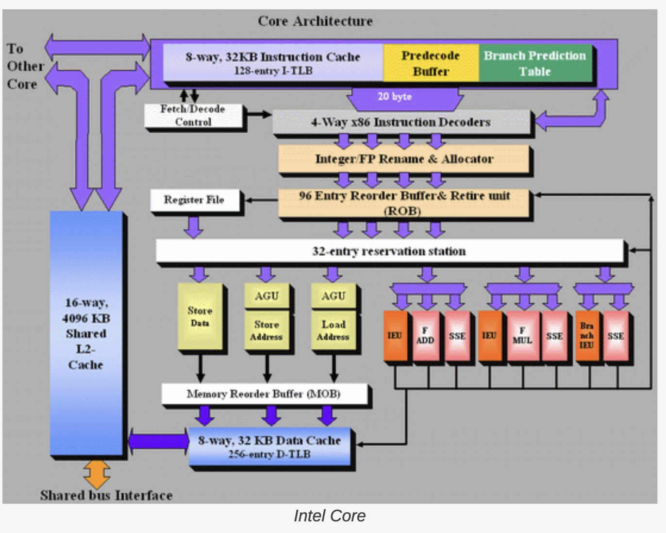 Intel Core Architecture의 OOO Engine에서 핵심 역할을 하는 것은 Reorder Buffer입니다. 이것은 Register Renaming과 동적 Data-Flow Graph의 태깅 및 유지를 담당하는 장치입니다.