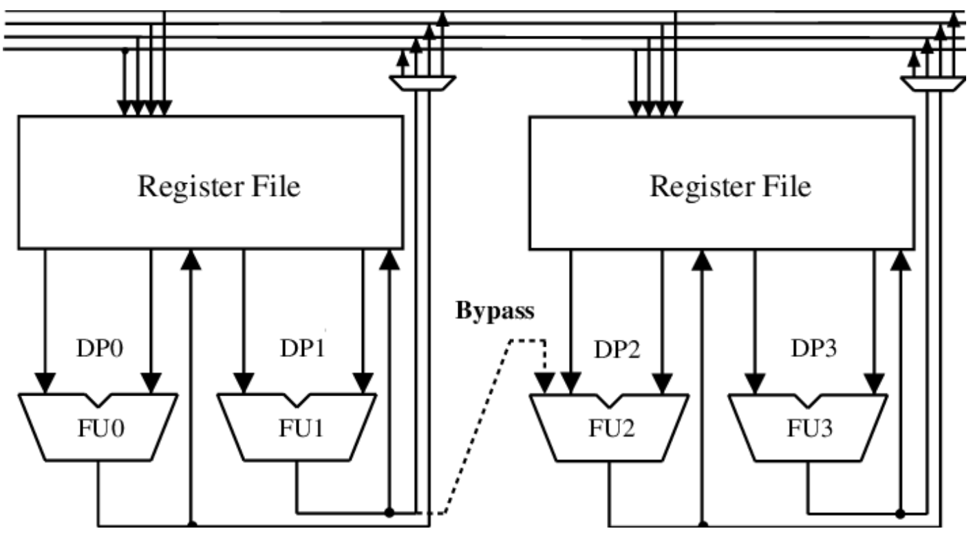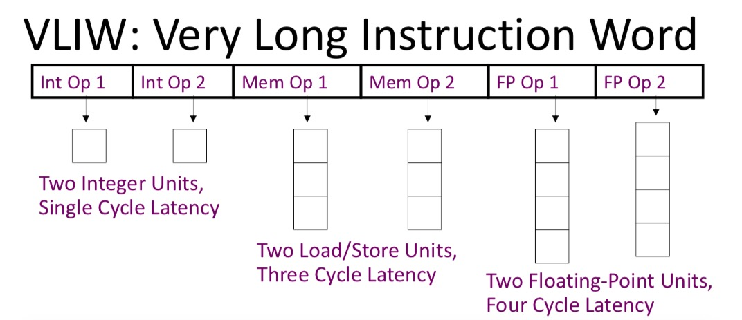 VLIW 아키텍처에서는 여러 Functional Unit이 병렬로 처리 가능한 구조를 갖추고 있으며, 명시적인(Explicit) 병렬 프로그래밍을 수행합니다. 각 사이클마다 하드웨어가 어떤 일을 해야 하는지를 명시적으로 표현하기 때문에, 하드웨어 제어 명령어가 매우 길어져서 “Very Long Instruction Word”라는 이름이 붙었습니다.