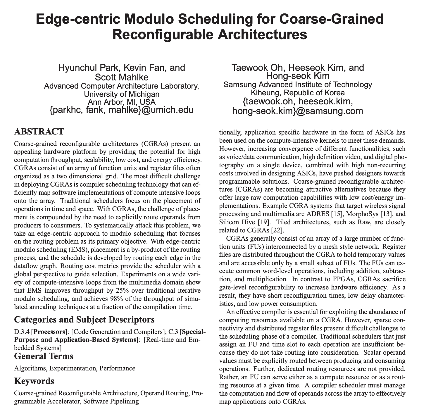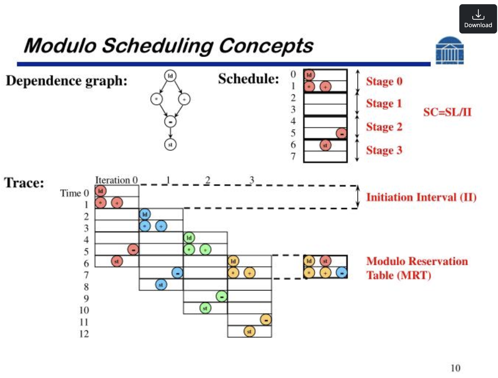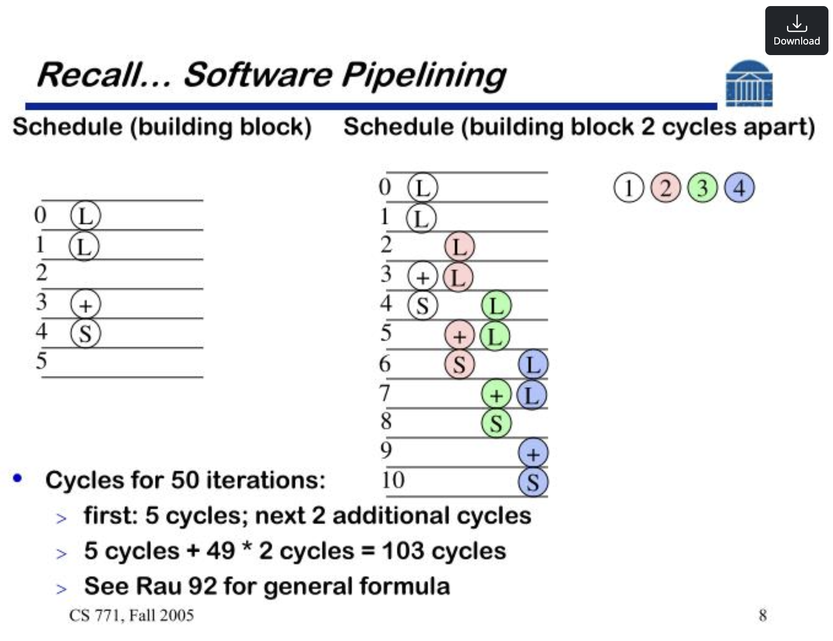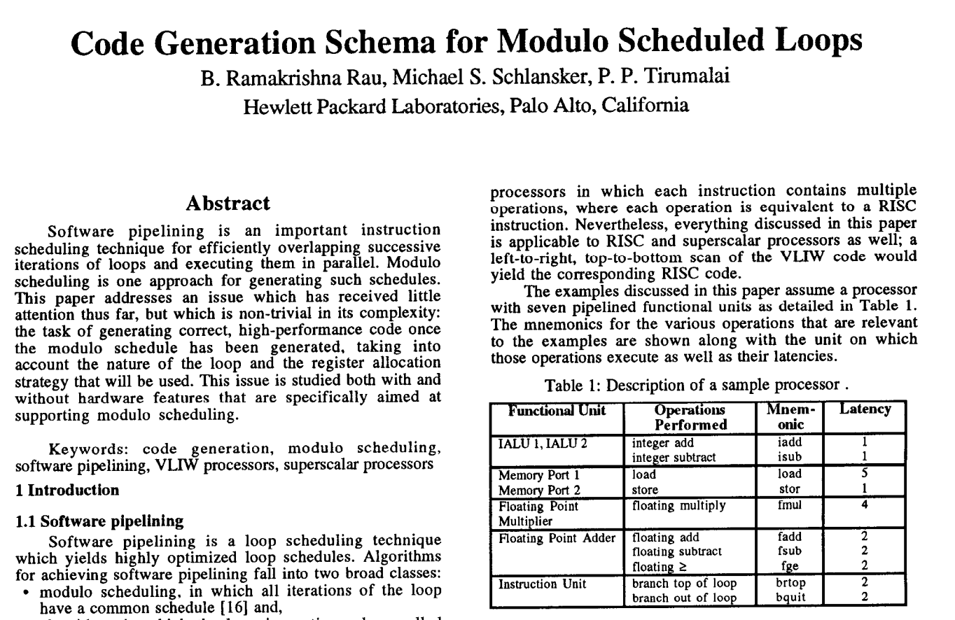 VLIW 아키텍처에서 소프트웨어 파이프라이닝을 실현하는 핵심 컴파일러 알고리즘은 Iterative Modulo Scheduling입니다. Bob Rau가 1992년 HP Labs에서 발표한 이 알고리즘은, OOO Processor가 하드웨어적으로 수행하는 데이터 플로우 그래프 기반 처리를 컴파일러가 소프트웨어적으로 수행하는 것과 유사한 역할을 합니다.