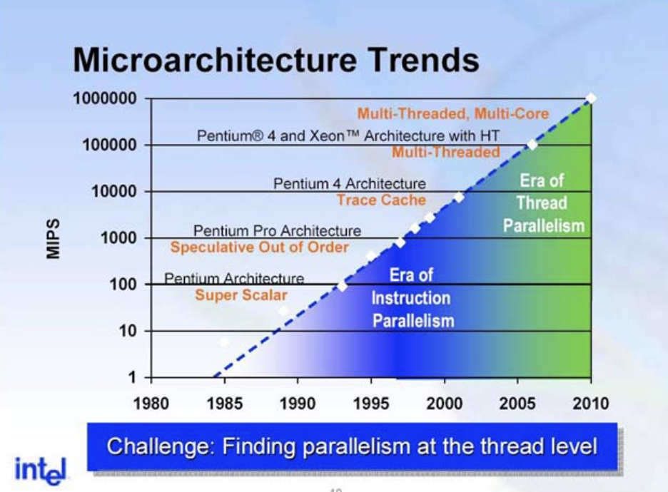 트랜지스터 집적도가 높아질수록 열 밀도가 상승하여 더 이상 클럭 속도를 올리는 것만으로는 성능을 향상시킬 수 없게 되었습니다. 이에 Intel은 ILP 추구에서 Multi-Core + Multi-Threading 방향으로 전략을 전환했습니다. 때마침 인터넷과 서버 시장이 성장하면서, 병렬 처리 프로세서의 중요성이 더욱 부각되었습니다.