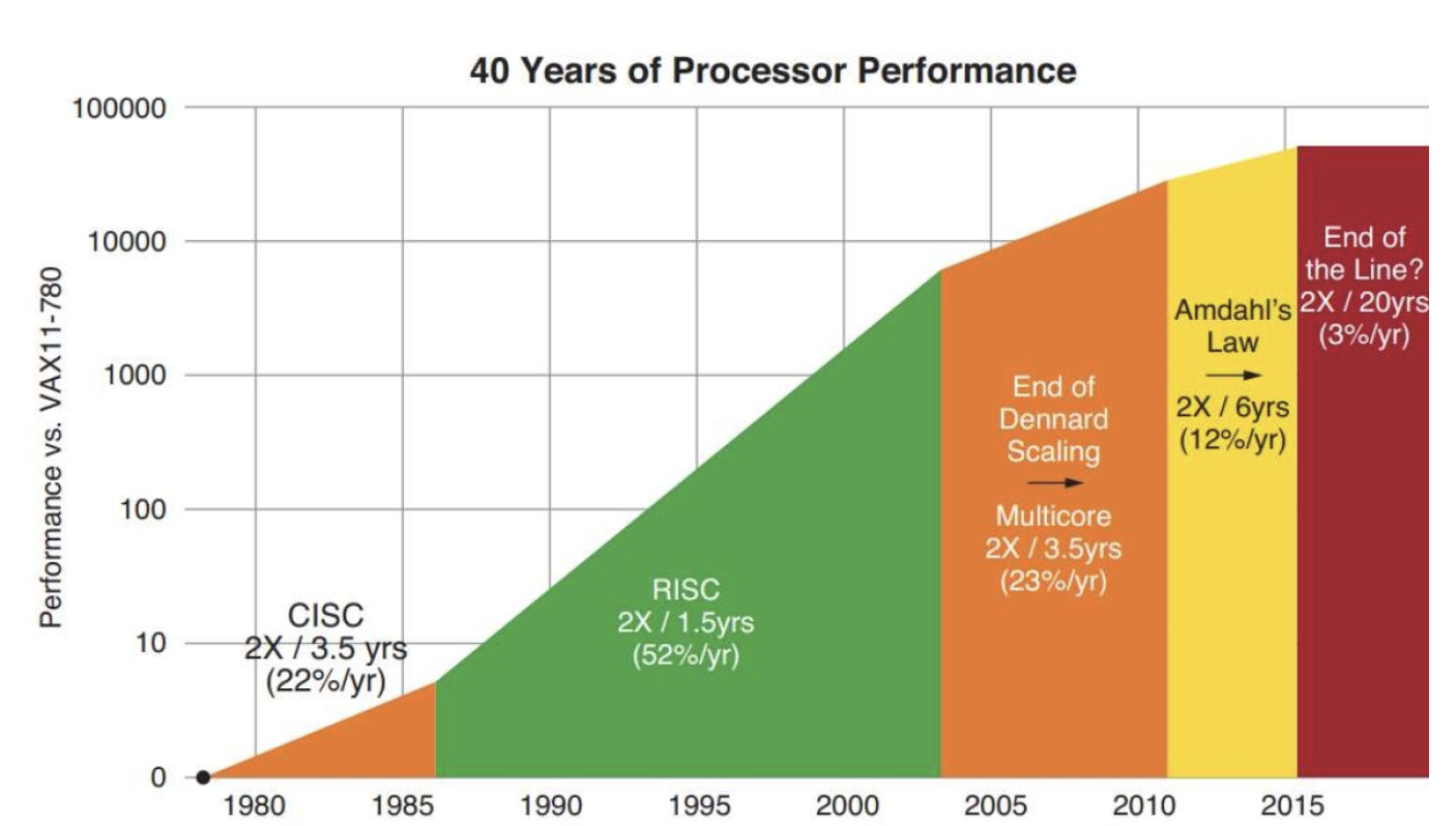 1990년대는 클럭 속도 향상과 ILP(Instruction-Level Parallelism) 극대화의 황금기였습니다. 그러나 2000년대에 들어서면서 Intel Pentium 4가 과도한 파이프라이닝으로 심각한 발열 문제를 일으키며 대실패를 겪었습니다. 이는 Dennard Scaling의 한계가 현실화된 것으로, Clock Frequency 경쟁이 사실상 종료되는 계기가 되었습니다.