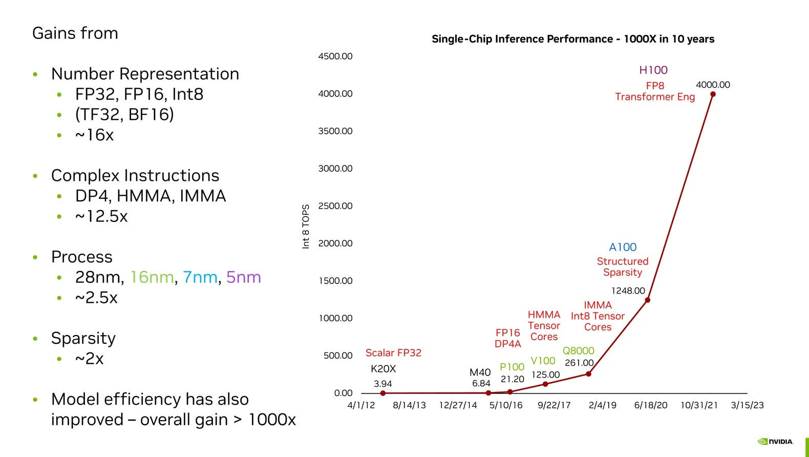 NVIDIA GPU는 원래 ML을 위해 설계된 것은 아니지만, Massive Parallelism이라는 특성이 ML 워크로드에 매우 적합했습니다. ML 붐과 함께 NVIDIA가 크게 성장하며, 컴퓨팅 성능은 세대마다 급속히 향상되었습니다.