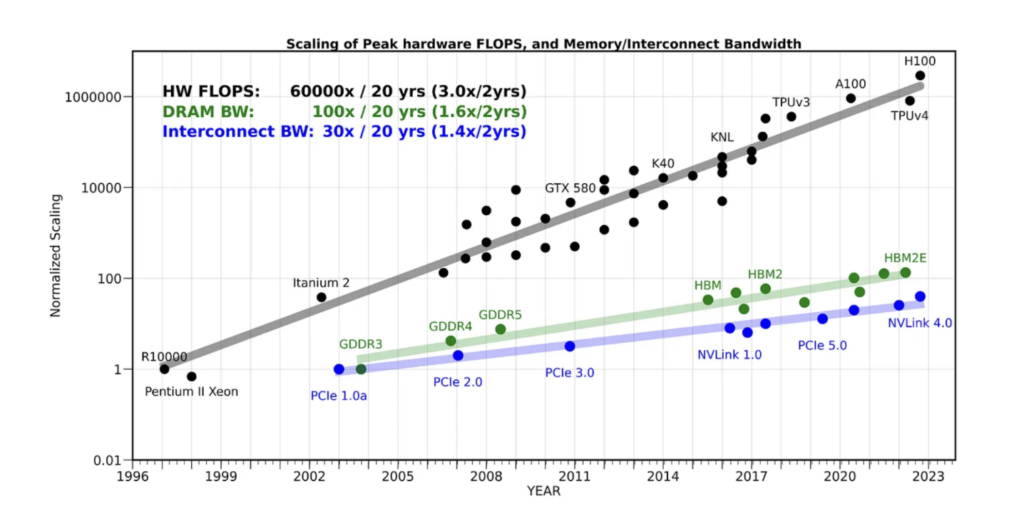 그러나 컴퓨팅 성능의 향상 속도와 메모리 대역폭의 향상 속도 사이의 갭이 점점 벌어지고 있습니다. Blackwell GPU에 이르러서는 성능의 한계점에 도달한 것이 아닌가 하는 논의가 나오고 있으며, DeepSeek 등의 등장으로 스케일업 vs. 효율성에 대한 논의가 활발해지고 있습니다.