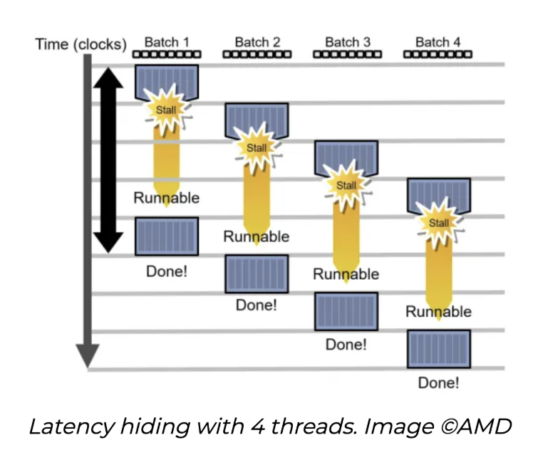 Multithreading의 핵심 아이디어는 간단합니다. 하나의 스레드가 메모리 접근으로 대기 중일 때, 즉시 다른 스레드를 실행하는 것입니다. 이렇게 하면 메모리 접근의 긴 Latency를 다른 유용한 작업으로 채울 수 있어, 전체 Throughput이 향상됩니다.