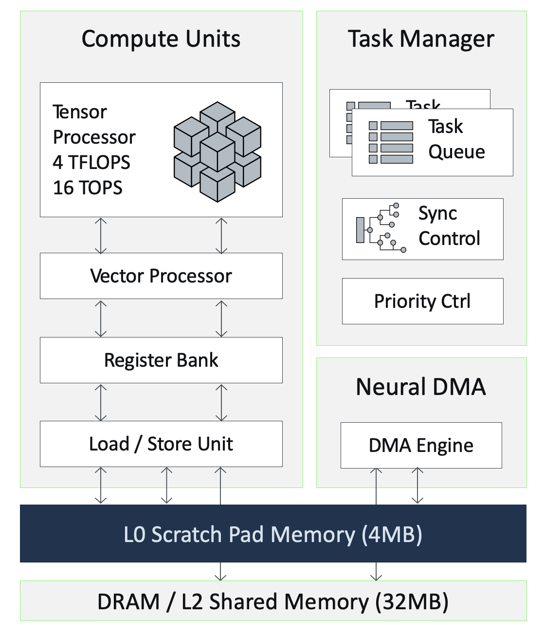 NPU 내부의 하드웨어는 횡적으로 펼쳐져 있으며, 각 유닛이 독립적으로 프로그래밍 가능합니다: